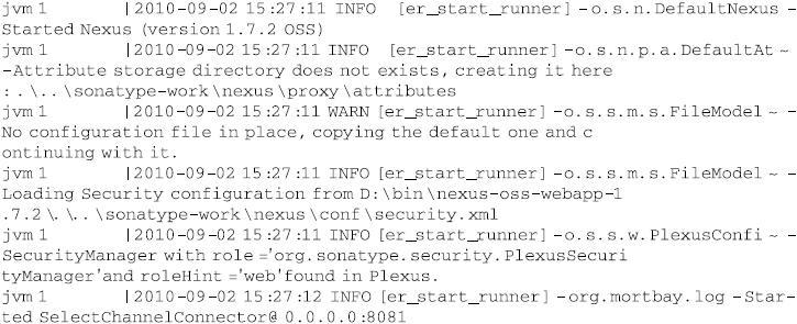 在Windows操作系统上,用户需进入nexus-webppp-1.7.2/bin/jsw/windows-x86-32/子目录,然后直接运行nexus.bat脚本就能启动Nexus。如果看到如下输出,就说明启动成功了: