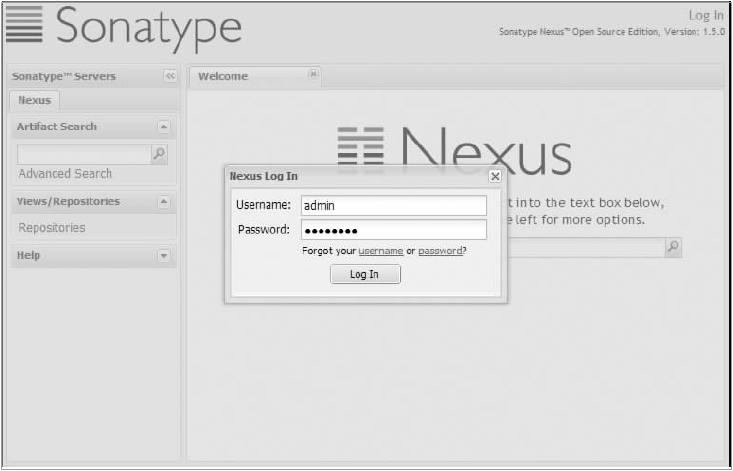 Nexus拥有全面的权限控制功能,默认的Nexus访问都是匿名的,而匿名用户仅包含一些最基本的权限,要全面学习和管理Nexus,就必须以管理员方式登录。可以单击界面右上角的Log In进行登录,Nexus的默认管理员用户名和密码为admin/admin123,如图9-2所示。 图9-2 使用默认用户名登录Nexus