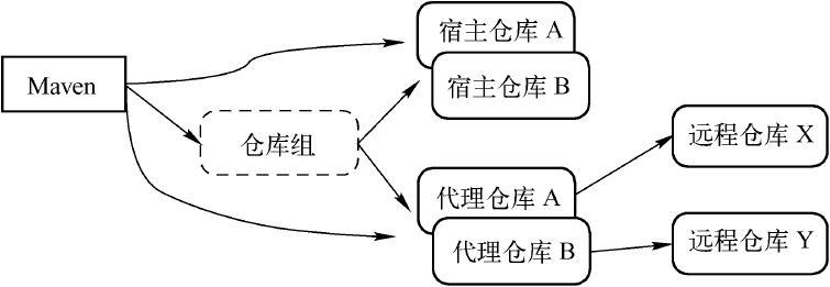 为了帮助读者理解宿主仓库、代理仓库和仓库组的概念,图9-4用更为直观的方式展现了它们的用途和区别。 图9-4 各种类型的Nexus仓库 从图9-4中可以看到,Maven可以直接从宿主仓库下载构件;Maven也可以从代理仓库下载构件,而代理仓库会间接地从远程仓库下载并缓存构件;最后,为了方便,Maven可以从仓库组下载构件,而仓库组没有实际内容(图中用虚线表示),它会转向其包含的宿主仓库或者代理仓库获得实际构件的内容。