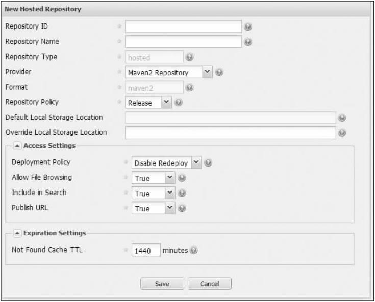 要创建一个宿主仓库,首先单击界面左边导航栏中的Repositories链接,在右边的面板中,选择Add,接着在下拉菜单中选择Hosted Repository,就会看到图9-5所示的配置界面。