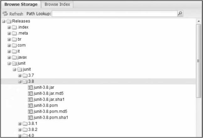 在Access Settings小组中,Deployment Policy用来配置该仓库的部署策略,选项有只读(禁止部署)、关闭重新部署(同一构件只能部署一次)以及允许重新部署。Allow File Browsing表示是否允许浏览仓库内容,一般选True。每个仓库(包括代理仓库和仓库组)都有一个Browse Storage选项卡,用户以树形结构浏览仓库存储文件的内容,如图9-6所示。Include in Search表示是否对该仓库进行索引并提供搜索,我们会在9.4节详细讨论索引和搜索。Publish URL用来控制是否通过URL提供服务,如果选False,当访问该仓库的地址时,会得到HTTP 404 Not Found错误。配置中最后的Not Found Cache TTL表示当一个文件没有找到后,缓存这一不存在信息的时间。以默认值1440分钟为例,如果某文件不存在,那么在之后的1440分钟内,如果Nexus再次得到该文件的请求,它将直接返回不存在信息,而不会查找文件系统。这么做是为了避免重复的文件查找操作以提升性能。