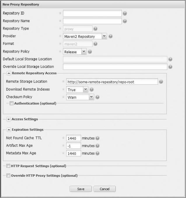 Access Settings的配置与宿主仓库类似,在此不再赘述。Expiration Settings较宿主仓库多了Artifact Max Age和Metadata Max Age。其中,前者表示构件缓存的最长时间,后者表示仓库元数据文件缓存的最长时间。对于发布版仓库来说,Artifact Max Age默认值为-1,表示构件缓存后就一直保存着,不再重新下载。对于快照版仓库来说,Artifact Max Age默认值为1440分钟,表示每隔一天重新缓存代理的构件。