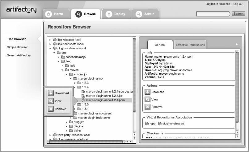 在Nexus发布之前,笔者曾一度是Artifactory的忠实用户,当时它是唯一的支持从用户界面配置仓库的私服。Artifactory的一大特点是使用数据库来存储仓库内容。读者可以自行访问JFrog站点以了解更多信息:http://www.jfrog.org/products.php。Artifactory目前的最新版本为2.2.5,其下载地址为http://www.jfrog.org/download.php。图9-25所示是Artifactory的仓库浏览界面。