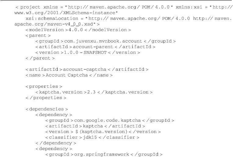 首先POM中的第一部分是父模块声明,如同account-email、account-persist一样,这里将父模块声明为account-parent。紧接着是该项目本身的artifactId和名称,groupId和version没有声明,将自动继承自父模块。再往下声明了一个Maven属性kaptcha.version,该属性用在依赖声明中,account-captcha的依赖除了SpringFramework和JUnit之外,还有一个com.google.code.kaptcha:kaptcha。Kaptcha是一个用来生成验证码(Captcha)的开源类库,account-captcha将用它来生成注册账户时所需要的验证码图片,如果想要了解更多关于Kaptcha的信息,可以访问其项目主页:http://code.google.com/p/kaptcha/。