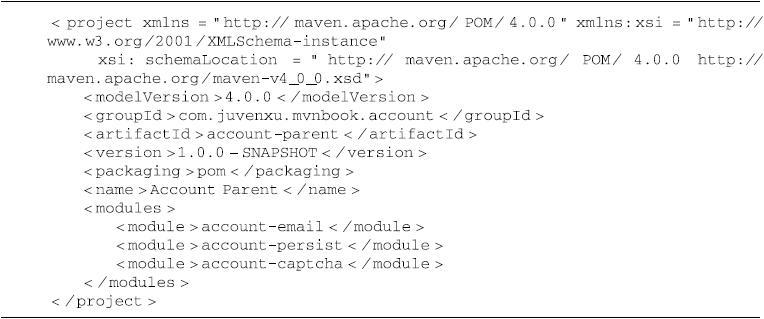 最后,不能忘记把account-captcha加入到聚合模块(也是父模块)account-parent中,见代码清单10-2。