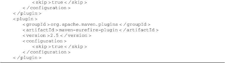 当然,也可以在POM中配置maven-surefire-plugin插件来提供该属性,如代码清单10-12所示。但这是不推荐的做法,如果配置POM让项目长时间地跳过测试,则还要测试代码做什么呢?