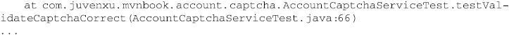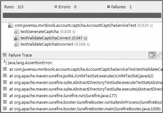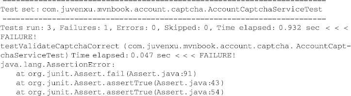以上展示了一些运行正确的测试报告,实际上,错误的报告更具价值。我们可以修改10.1.3节代码清单10-11中的AccountCaptchaServiceTest让一个测试失败,这时得到的简单文本报告会是这样: