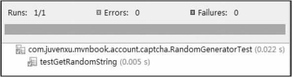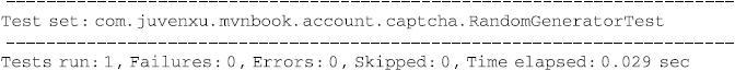 例如,运行10.1.3节代码清单10-10中的RandomGeneratorTest后会得到一个名为com.juvenxu.mvnbook.account.captcha.RandomGeneratorTest.txt的简单文本测试报告和一个名为TEST-com.juvenxu.mvnbook.account.captcha.RandomGeneratorTest.xml的XML测试报告。前者的内容十分简单: