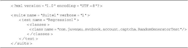 TestNG允许用户使用一个名为testng.xml的文件来配置想要运行的测试集合。例如,可以在account-captcha的项目根目录下创建一个testng.xml文件,配置只运行RandomGeneratorTest,如代码清单10-17所示。