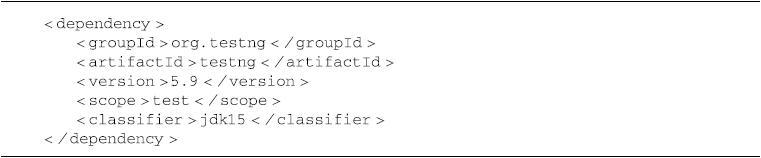 与JUnit类似,TestNG的依赖范围应为test。此外,TestNG使用classifier jdk15和jdk14为不同的Java平台提供支持。