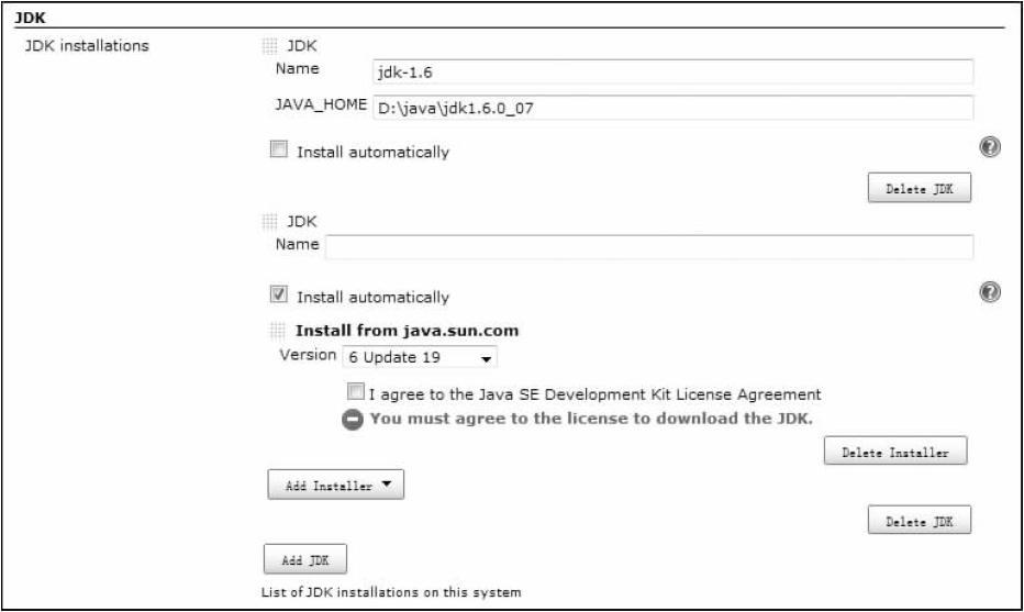在系统设置页面,首先要配置的是Hudson将使用的JDK。在页面中找到对应的部分,然后单击Add JDK按钮,Hudson就会提示用户进行安装。Hudson默认会提示自动安装JDK,用户可以看到一个Install automatically的复选框是被选上的,当单击“同意JDK许可证协议”并选择一个JDK版本后,Hudson就会自动下载安装相应版本的JDK。