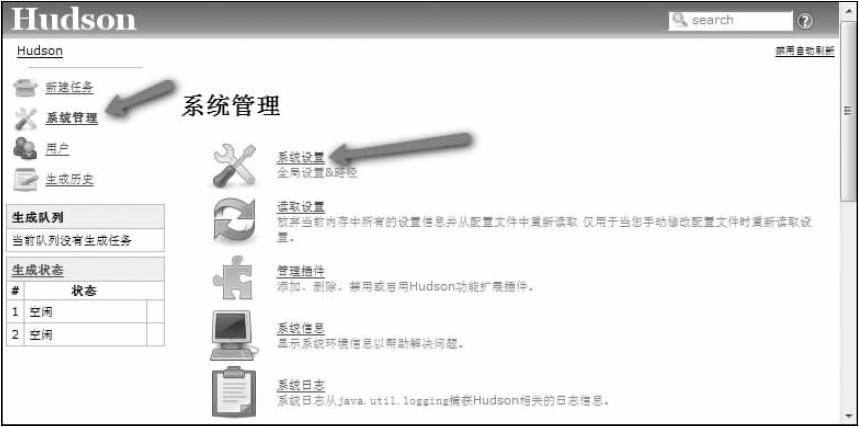 用户应该单击Hudson登录页面左边的“系统管理”,然后单击页面右侧的“系统设置”以进入系统设置页面,如图11-6所示。