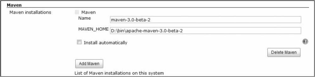 与JDK配置类似,用户也可以选择手动或者自动安装Maven供Hudson使用,还可以安装多个版本的Maven供Hudson集成任务使用。图11-8显示了手动方式指定maven-3.0-beta-2的安装位置。
