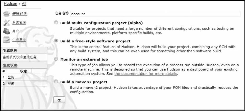 要创建一个Hudson任务来持续集成Maven项目,首先单击页面左边的新建任务,然后就需要在页面右边选择任务的名称及类型。对于一般的Maven项目来说,可选择的类型有Build a free-style software project和Build a maven2 project。前者不仅支持Maven项目,还支持其他类型的构建工具,如Ant、Shell。对于Maven用户来说,两者最大的不同在于前者需要用户进行多一点的配置,而后者会使用Hudson自带的Maven,且从项目的POM中获取足够的信息以免去一些配置。除非你已经十分熟悉Hudson,笔者推荐选择free-style类型(见图11-10)。因为这种方式更可控制,当任务出现问题的时候也更容易检查。