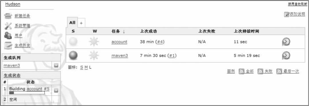·生成状态:页面左边下面的部分,表示正在执行构建的任务,如图11-19中有一个account的构建任务正在执行。