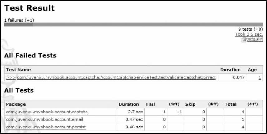 图11-22还显示了项目的测试结果信息,为了获得这样的信息需要做一些额外的配置。在11.6.1节中,maven-surefire-plugin会在项目的target/surefire-reports目录下生成与JUnit兼容的XML格式测试报告,Hudson能够基于这种格式的文件生成图形化的测试报告。