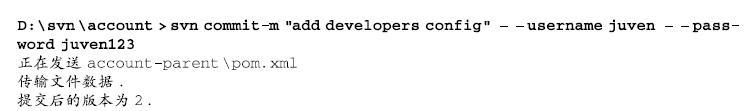 至此,就完成了一个简单的Subversion仓库用户权限配置。像日常开发一样,接下来在Subversion客户端分别使用这几个用户名对代码进行更改后提交至Subversion仓库。例如,对account-parent模块的pom.xml加入developers配置后,再使用如下svn命令提交更改: