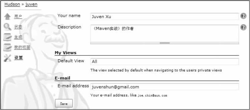 单击Save按钮后,一个Hudson用户的信息就完整了。