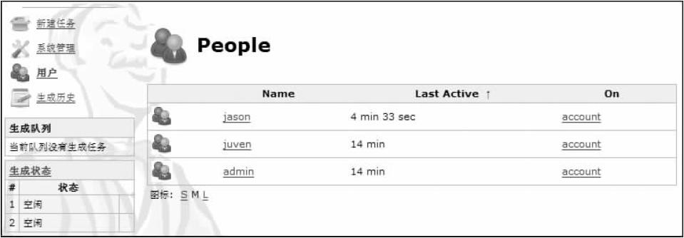 待Hudson得到这些更改并触发集成任务之后,相关的Subversion用户信息就已经被Hudson存储起来了。单击Hudson页面左边的用户,然后就能在页面右边看到相关的用户信息,包括用户名、最近活动时间及相关的Hudson任务,如图11-30所示。