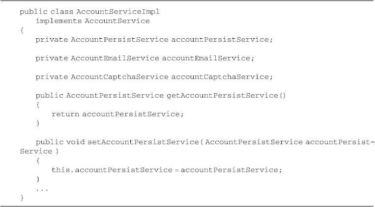 三个私有变量来自account-persist、account-email和account-captcha模块,它们都有各自的get()和set()方法,并且通过Spring注入。