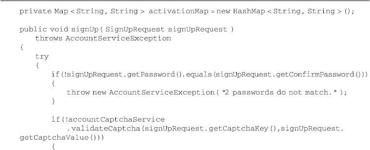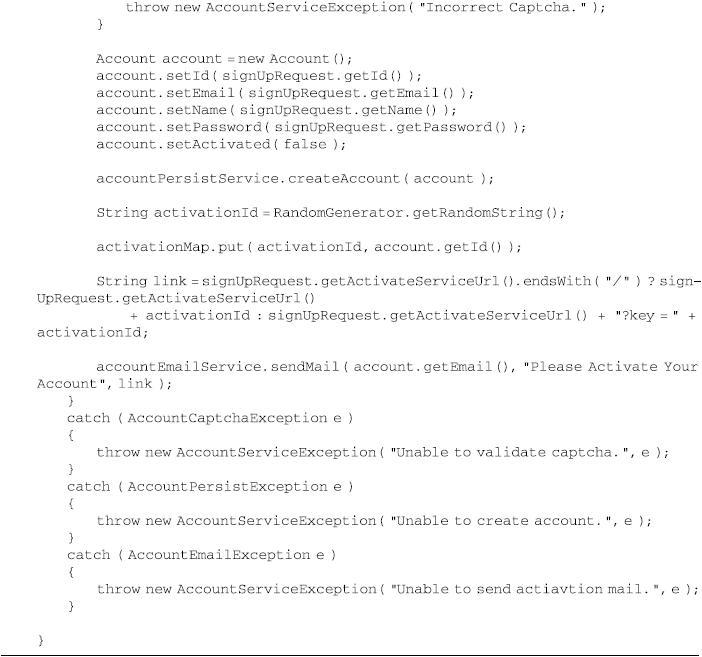 signUp()方法首先检查请求中的两个密码是否一致,接着使用accountCaptchaService检查验证码,下一步使用请求中的用户信息实例化一个Account对象,并使用accountPersistService将用户信息保存。下一步是生成一个随机的激活码并保存在临时的activateMap中,然后基于该激活码和请求中的服务器URL创建一个激活链接,并使用accountEmailService将该链接发送给用户。如果其中任何一步发生异常,signUp()方法会创建一个一致的AccountServiceExcpetion对象,提供并抛出对应的异常提示信息。