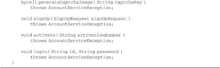 正如4.3.1节介绍的那样,该接口提供5个方法。generateCaptchaKey()用来生成一个验证码的唯一标识符。generateCaptchaImage()根据这个标识符生成验证码图片,图片以字节流的方式返回。用户需要使用signUp()方法进行注册,注册信息使用SignUpRequest进行封装,这个SignUpRequest类是一个简单的POJO,它包含了注册ID、email、用户名、密码、验证码标识、验证码值等信息[1]。注册成功之后,用户会得到一个激活链接,该链接包含了一个激活码,这个时候用户需要使用activate()方法并传入激活码以激活账户。最后,login()方法用来登录。