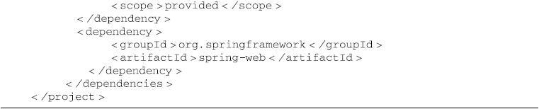 如上述代码所示,account-web的packaging元素值为war,表示这是一个Web项目,需要以war方式进行打包。account-web依赖于servlet-api和jsp-api这两个几乎所有Web项目都要依赖的包,它们为servlet和jsp的编写提供支持。需要注意的是,这两个依赖的范围是provided,表示它们最终不会被打包至war文件中,这是因为几乎所有Web容器都会提供这两个类库,如果war包中重复出现,就会导致潜在的依赖冲突问题。account-web还依赖于account-service和spring-web,其中前者为Web应用提供底层支持,后者为Web应用提供Spring的集成支持。