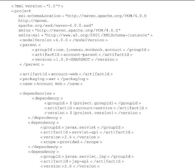 除了使用打包方式war之外,Web项目的POM与一般项目并没多大的区别。account-web的POM代码见代码清单12-8。
