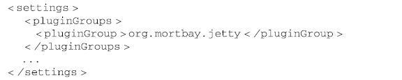 下一步启动jetty-maven-plugin。不过在这之前需要对settings.xml做个微小的修改。前面介绍过,默认情况下,只有org.apache.maven.plugins和org.codehaus.mojo两个groupId下的插件才支持简化的命令行调用,即可以运行mvn help:system,但mvn jetty:run就不行了。因为maven-help-plugin的groupId是org.apache.maven.plugins,而jetty-maven-plugin的groupId是org.mortbay.jetty。为了能在命令行直接运行mvn jetty:run,用户需要配置settings.xml如下: