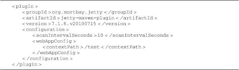 jetty-maven-plugin并不是官方的Maven插件,它的groupId是org.mortbay.jetty,上述代码中使用了Jetty 7的最新版本。在该插件的配置中,scanIntervalSeconds顾名思义表示该插件扫描项目变更的时间间隔,这里的配置是每隔10秒。需要注意的是,如果不进行配置,该元素的默认值是0,表示不扫描,用户也就失去了所谓的自动化热部署的功能。上述代码中webappConfig元素下的contextPath表示项目部署后的context path。例如这里的值为/test,那么用户就可以通过http://hostname:port/test/访问该应用。