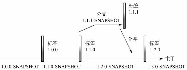 图13-2下方最长的箭头表示项目的主干,项目最初的版本是1.0.0-SNAPSHOT,经过一段时间的开发后,1.0.0版本发布,这个时候就需要打一个标签,图中用一个长条表示。然后项目进入1.1.0-SNAPSHOT状态,大量的开发工作都完成在主干中,添加了一些新特性并修复了很多Bug之后,项目1.1.0发布,同样,这时候需要打另一个标签。发布过后,项目进入1.2.0-SNAPSHOT阶段,可这个时候用户报告1.1.0版本有一个重大的Bug,需要尽快修复,我们不能在主干中修Bug,因为主干有太多的变化,无法在短时间内测试完毕并发布,我们也不能停止1.2.0-SNAPSHOT的开发,因此这时候可以基于1.1.0创建一个1.1.1-SNAPSHOT的分支,在这里进行Bug修复,然后为用户发布一个1.1.1增量版本,同时打上标签。当然,还不能忘了把Bug修复涉及的变更合并到1.2.0-SNAPSHOT的主干中。主干在开发一段时间之后,发布1.2.0版本,然后进入到新版本1.3.0-SNAPSHOT的开发过程中。