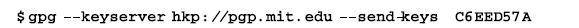 为了能让你的用户获取公钥并验证你分发的文件,需要将公钥分发到公钥服务器中。例如,hkp://pgp.mit.edu是美国麻省理工学院提供的公钥服务器,运行如下命令可将公钥分发到该服务器中: