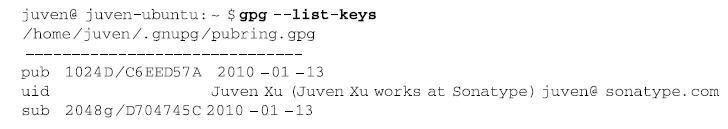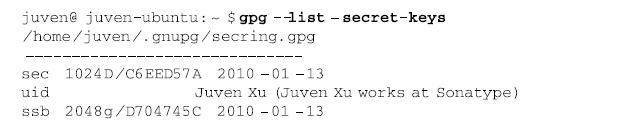 上述就是一个基本的签名、分发并验证的流程,在使用Maven发布项目的时候,可以使用GPG为发布文件提供签名。现在读者应该已经知道如何手工完成这一步骤了,下面介绍如何使用Maven GPG Plugin自动化签名这一步骤。