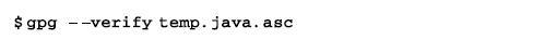 在该例中,GPG会创建一个名为temp.java.asc的签名文件,这时就可以将这个后缀名为.asc的签名文件连同原始文件一起分发给你的用户。如果你的用户已经导入了你的公钥,就可以运行如下命令验证原始文件: