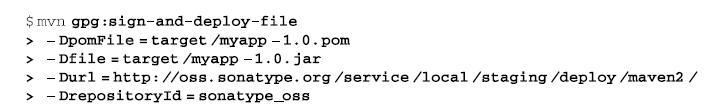 如果有一些已经发布了但没有被签名的文件,你仍然想对其签名并发布到Maven仓库中,上述方式显然是行不通的,因为POM已经不允许被修改。好在Maven GPG Plugin为此提供了另外一个目标。例如: