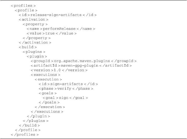 读者可以想到,GPG签名这一步骤只有在项目发布时才显得必要,对日常的SNAPSHOT构件进行签名不仅没有多大的意义,反而会比较耗时。因此,只需要配置Maven PGP Plugin在项目发布的时候运行,那么如何判断项目发布呢?回顾代码清单13-3,在超级POM中有一个release-profile,该Profile只有在Maven属性performRelease为true的时候才被激活,而release:perform执行的时候,就会将该属性置为true,这正是项目进行版本发布的时刻。因此,类似地,可以在settings.xml或者POM中创建如代码清单13-6所示Profile。