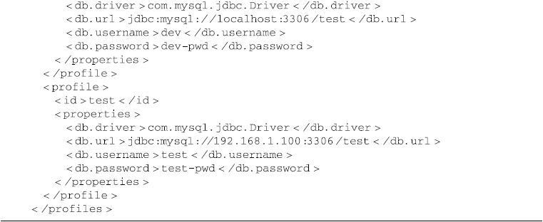继续以14.2节介绍的数据库差异为例,代码清单14-4引入了一个针对开发环境的profile,类似地,可以加入测试环境和产品环境的profile,如代码清单14-8所示。