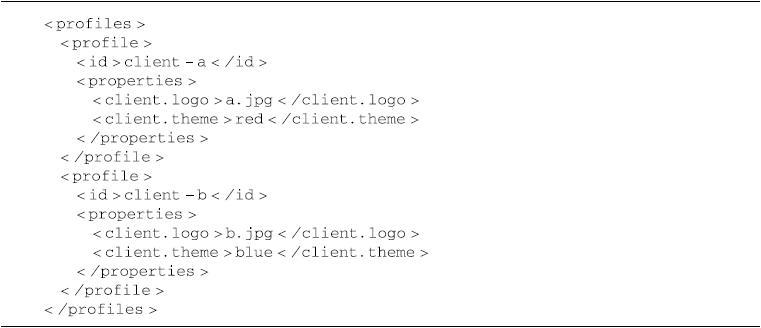不过有的时候,我们可能希望在构建项目的时候,为不同的客户使用不一样的资源文件(例如客户的logo图片不同,或者css主题不同)。这时可以在web资源文件中使用Maven属性,例如用${client.logo}表示客户的logo图片,用${client.theme}表示客户的css主题。然后使用profile分别定义这些Maven属性的值,如代码清单14-18所示。