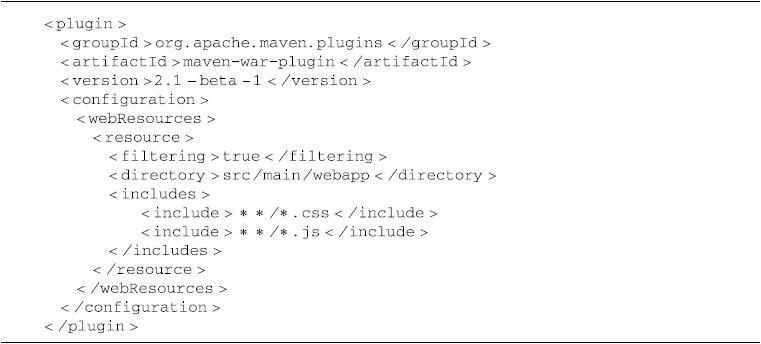 代码清单14-19中声明了web资源目录src/main/webapp(这也是默认的web资源目录),然后配置filtering开启过滤,并且使用includes指定要过滤的文件,这里是所有css和js文件。读者可以模仿上述配置添加额外的web资源目录,选择是否开启过滤,以及包含或者排除一些该目录下的文件。