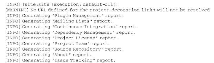 配置了正确版本的maven-site-plugin之后,在项目下运行mvn site就能直接生成一个最简单的站点,用户可以看到如下方代码所示的命令行输出。