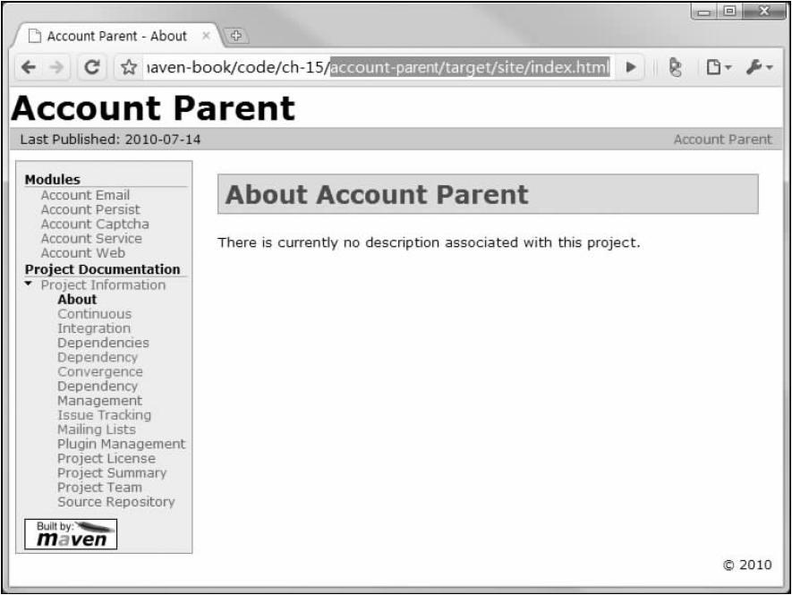 待Maven运行完毕后,可以在项目的target/site/目录下找到Maven生成的站点文件,包括dependencies.html、dependency-convergence.html、index.html等文件和css、images文件夹。读者能够从这些文件及文件夹的名字中猜到其中的内容:css和images文件夹是用来存放站点相关的图片和css文件的,其他html文件基本对应了一项项目信息,如dependencies.html包含了项目依赖信息,license.html包含了项目许可证信息。index.html则是站点的主页面,用浏览器打开就能看到图15-1所示的页面。
