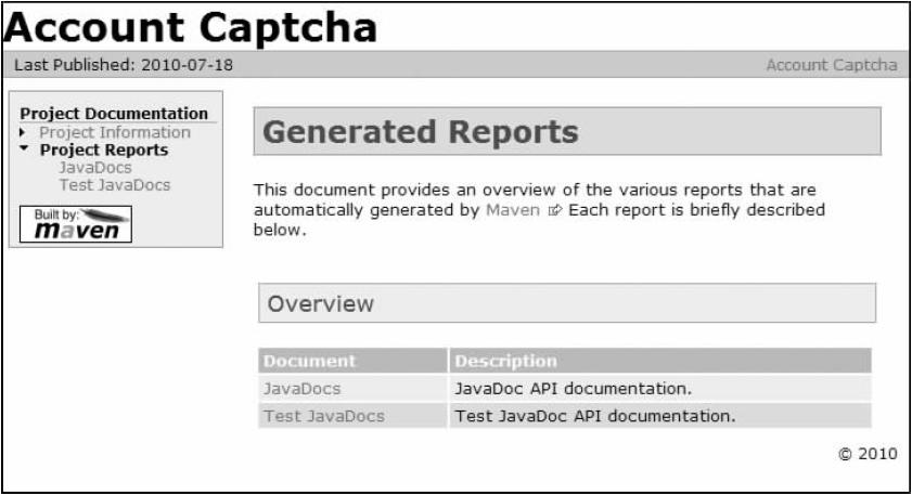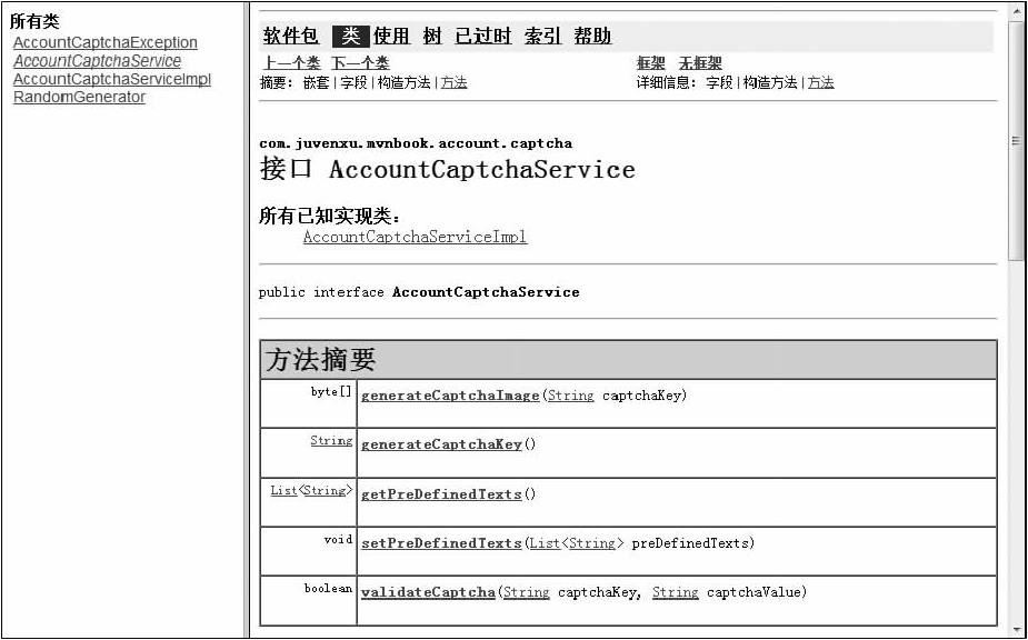 图15-4左侧的导航栏有两个类别,Project Information包含了15.2节讲述的各类基本信息,Project Reports则包含其他插件生成的报告。这里能看到maven-javadoc-plugin生成JavaDocs和Test JavaDocs文档,单击相应链接就能查看具体文档,如图15-5所示。