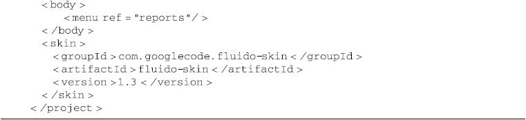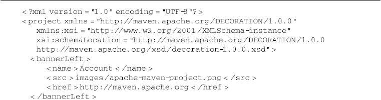 要自定义站点外观,用户必须创建一个名为site.xml的站点描述符文件,且默认该文件应该位于项目的src/site目录下。该站点描述符文件是由XML Schema约束定义的,相关的xsd文件位于http://maven.apache.org/xsd/decoration-1.0.0.xsd。 一个简单的站点描述符文件如代码清单15-9所示。 代码清单15-9 站点描述符文件 该描述符文件定义了一个站点头部横幅图片、一个导航栏菜单项以及一个站点皮肤。下面详细介绍各类可在站点描述符中定义的内容。