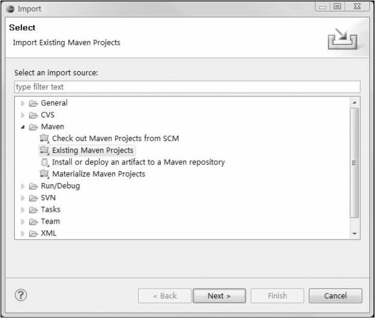 较之于创建新的Maven项目,实际工作中更常见的是导入现有的Maven项目。m2eclipse支持多种导入的方式,其中最常用的是导入本地文件系统的Maven项目以及导入SCM仓库中的Maven项目。