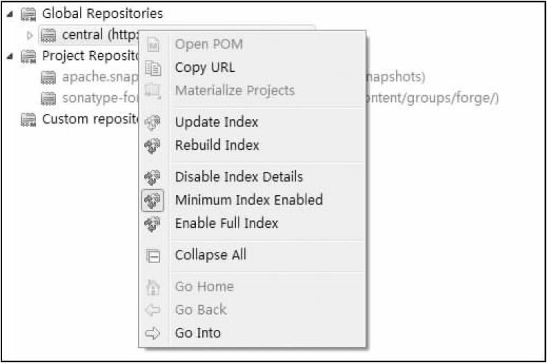 图16-16中的菜单还有几个选项,Disable Index Details让m2eclipse关闭该仓库的索引,从而用户将无法浏览该仓库的内容,或者对其进行搜索。Minimum Index Enabled表示只对仓库内容的坐标进行索引,而Enable Full Index不仅索引仓库内容的坐标,还索引这些文件所包含的Java类信息,从而能够支持用户搜索仓库中的Java类。