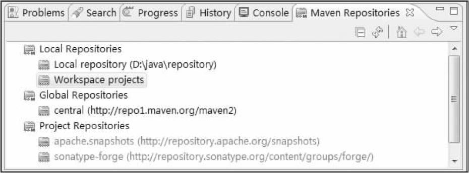 其中本地仓库包含了Maven的本地仓库以及当前Eclipse工作区的项目;全局仓库默认是Maven中央仓库,但是如果在settings.xml中设置了镜像,全局仓库就会自动变更为镜像仓库。最后,如果当前Maven项目的pom.xml中配置了其他仓库,它们就会被自动加入到项目仓库这一类中。这些仓库的信息来源于用户的settings.xml文件和工作区中Maven项目的pom.xml文件。
