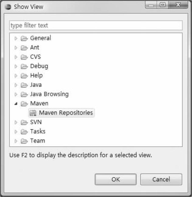 m2eclipse提供了Maven仓库视图,能让用户方便地浏览本地及远程仓库的内容,不过默认情况下该视图不被开启。要开启Maven仓库视图,依次选择Eclipse菜单栏中的Windows、Show View、Other选项,Eclipse会弹出一个对话框让用户选择要打开的视图。选择Maven类下的Maven Repositories,如图16-13所示。