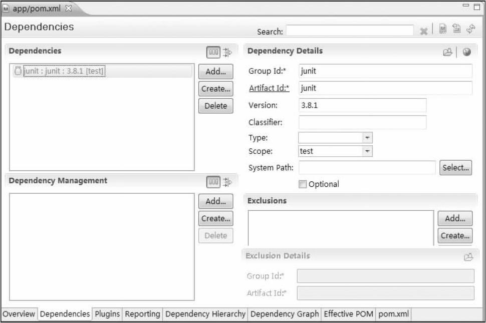 第二种快速添加依赖的方式是使用m2eclipse的POM编辑器。默认情况下,用户双击项目的pom.xml就能打开POM编辑器。POM编译器下方有很多选项卡,包括概览、依赖、插件、报告、依赖层次、依赖图、Effective POM等。其中,依赖(Dependencies)一项可以用来添加、删除和编辑依赖,如图16-21所示。