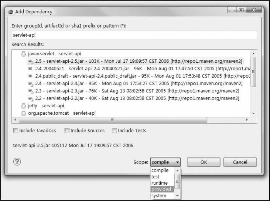 在弹出的对话框中,用户只需要输入必要的关键字,然后选择要添加的依赖及版本,并且设定正确的依赖范围,单击OK按钮之后,依赖就被自动加入到pom.xml中。图16-20所示就为项目添加了javax.servlet:servlet-api:2.5这样一个依赖,并且在图的下方选择了provided这样一个依赖范围。