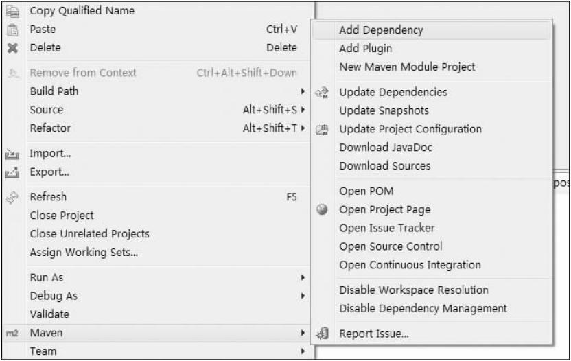 首先用户可以在项目上或者pom.xml上右击,然后选择Maven,再选择Add Dependency添加依赖,如图16-19所示。